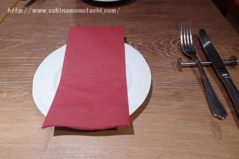 ぬくもりのある木のテーブル。赤い紙ナプキンがセットされていました。