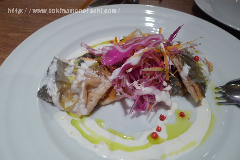 色合いがとてもきれいです!!一皿目からレベルが高くて嬉しくなってしまいました。二人分が1つのお皿に盛りつけられているので、二人で取り分けながら食べます。