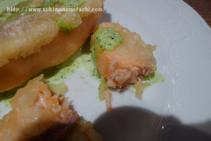 ソースはハーブのクリームソースです。たっぷりかけました。さっぱりしていて食べやすいです。