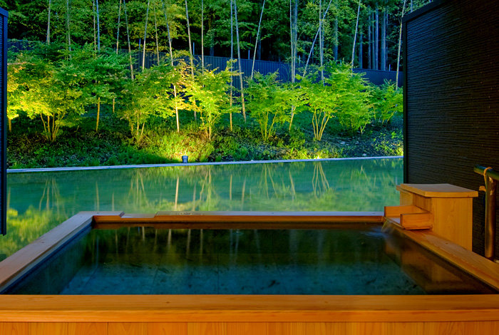 本来であれば、湯船の前の水盤に水が満たされるようです。水盤の奥には竹林があります。コンクリートがむき出しでしたが、夜間の利用でライトアップもされていたので、あまり気になりませんでした。