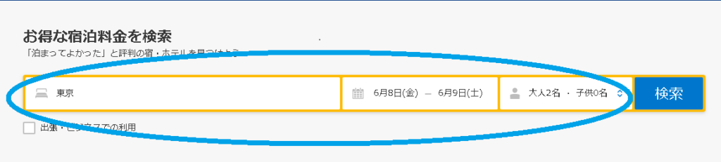 ①「宿泊予定の都市」「日付」「人数」等を入力して検索