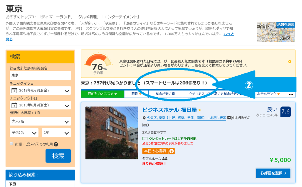 ②スマートセール対象の宿の件数が表示される
