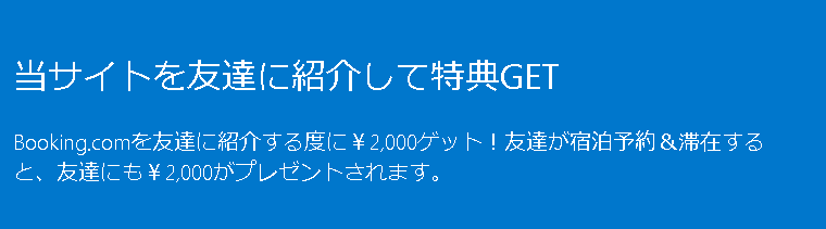 Booking.comに友だちを紹介すると2,000円をもらうことができます。その友達が宿泊をすると、友だちにも2,000円がプレゼントされます。