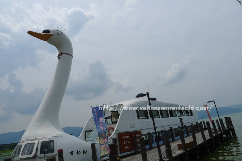 【諏訪湖・遊覧船】武田信玄の水中墓伝説あり。売店にはバッタソフトとバッタ飴を発見