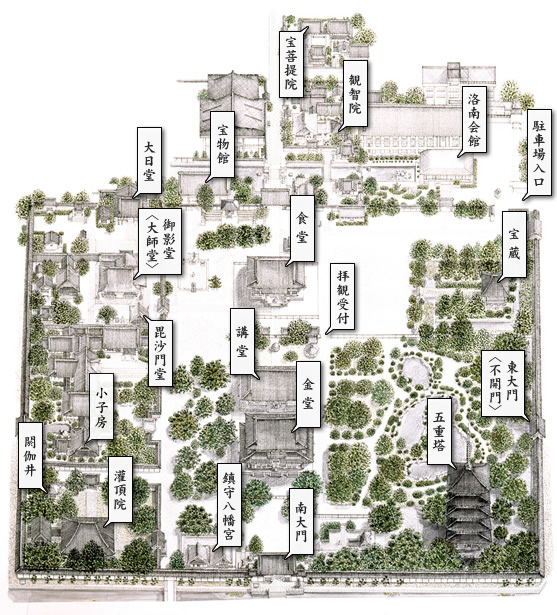 東寺は平安京鎮護のための官寺として建立が始められた後、嵯峨天皇より空海(弘法大師)に下賜され、真言密教の根本道場として栄えた。中世以降の東寺は弘法大師に対する信仰の高まりとともに「お大師様の寺」として庶民の信仰を集めるようになり、21世紀の今日も京都の代表的な名所として存続している。Wikipedia