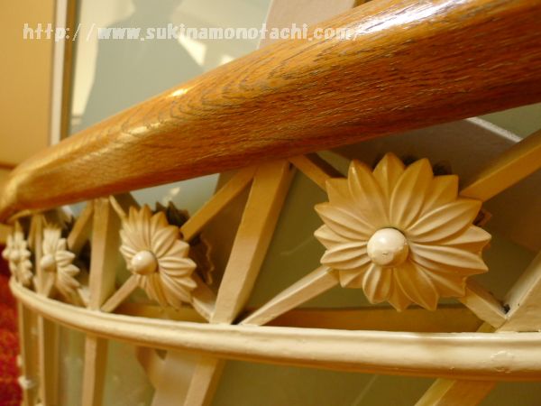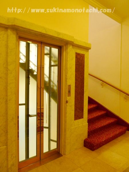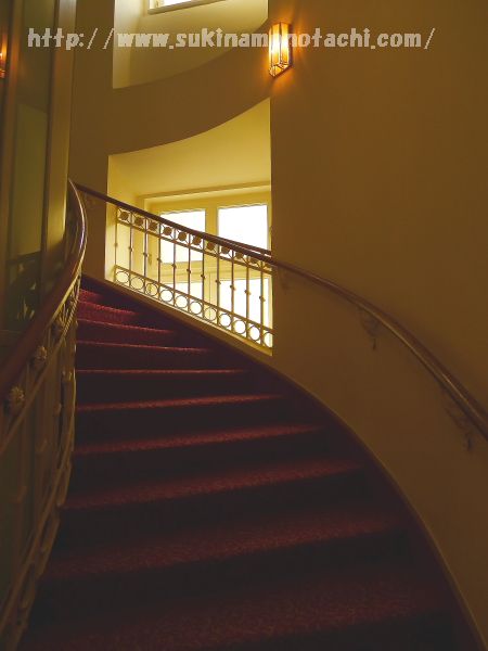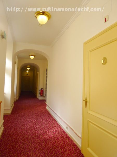 少し写真が暗いですが、ヨーロッパらしい赤いじゅうたんが敷かれた階段を登っていきます。