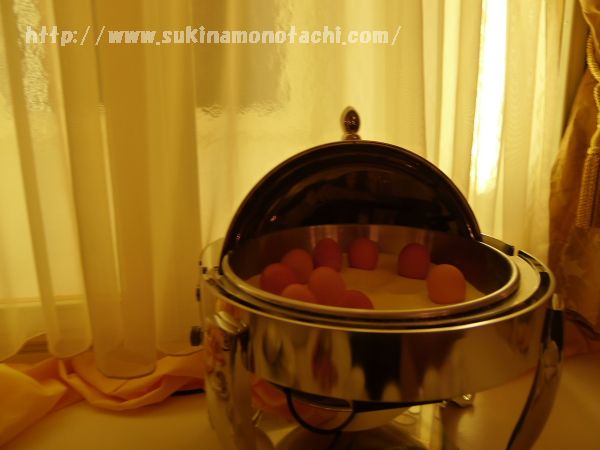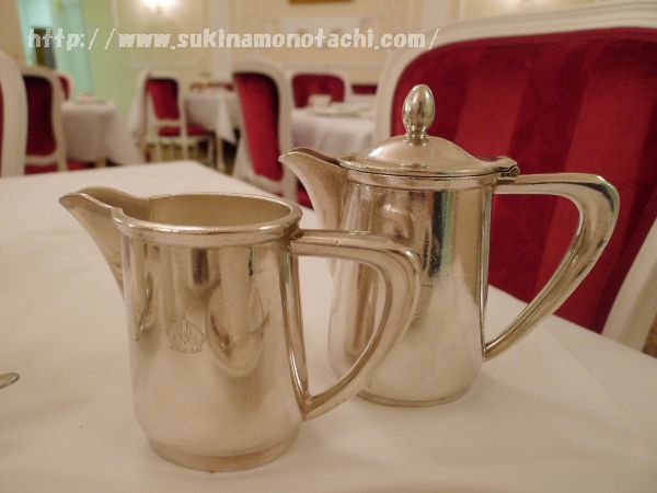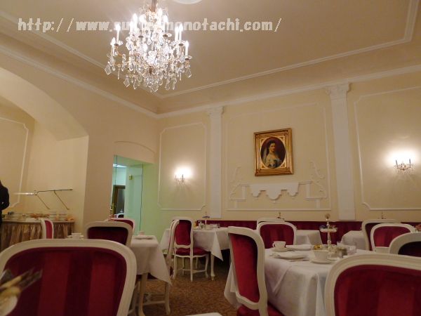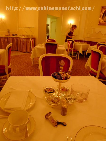 朝食は食堂でビュッフェ。白いテーブルクロスにチェアの赤が映えてとても落ち着いた雰囲気でした。シャンデリアもキラキラ。