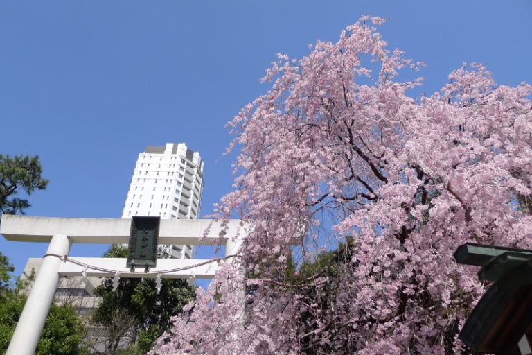 乃木坂駅の出口を出たら、すぐ横が乃木神社!迎えてくれるのは、白い石造りの一の鳥居と、鳥居のすぐそばにある見事なしだれ桜!