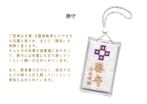 乃木希典が戦争で数々の功績をあげたことから、勝負運・仕事運アップなどの御利益があるとされています。勝負ごとだけでなく病気や自分自身に打ち勝ってく!という願いが込められた「勝守」が人気です。