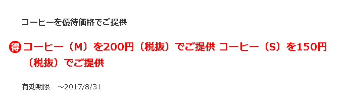 飲み物1杯につき1つスタンプが貯まります。10個スタンプが貯まれば飲み物1杯と交換することができます。(コーヒー、カフェラテ、オレンジジュース、野菜ジュースのいずれか)