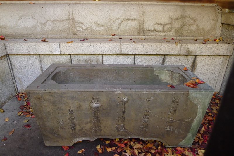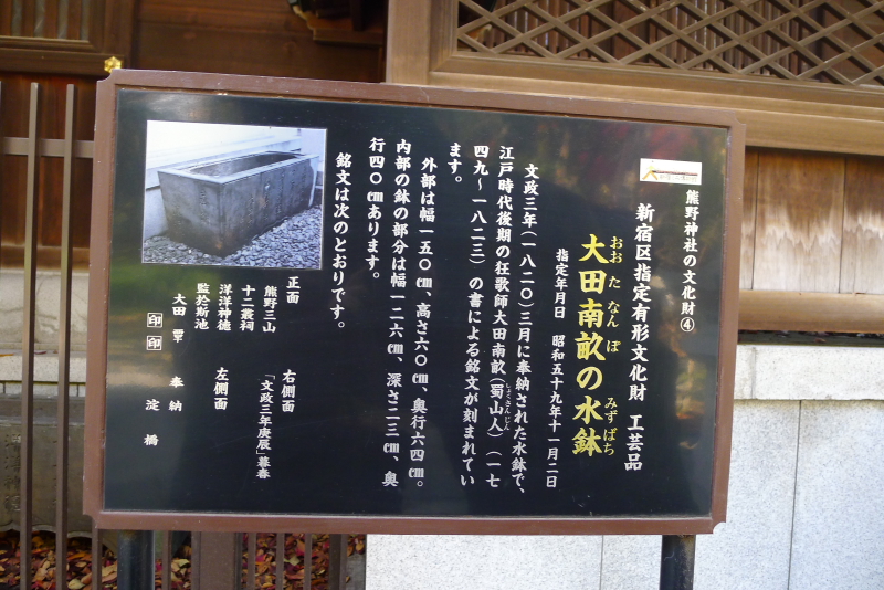 社殿の右わきにある水鉢。柵に囲われて、一切近づけないのですが、柵の間からパチリ。さらっと置かれてありますが、こちらも新宿区指定有形文化財。